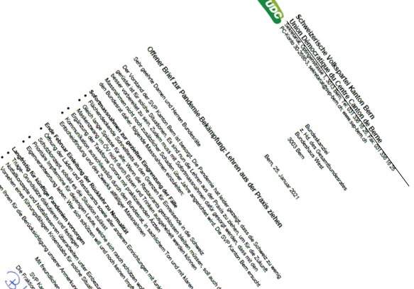 Die Pandemie hat leider gezeigt, dass die Schweiz zu wenig gerüstet ist für solche Situationen. Auf Antrag des Präsidenten der SVP-Gesundheitskommission Martin Schlup hat der Parteivorstand der SVP Kanton Bern einen offenen Brief zu Handen des Bundesrates verabschiedet. Die SVP Kanton Bern fordert den Bundesrat darin auf, praktische Aspekte in der Pandemiebekämpfung mehr zu berücksichtigen und für die Zukunft einen Krisenstab und Notfallkonzepte vorzusehen, welche den Praxistest auch bestehen. Grossrat Martin Schlup ist es ein Anliegen, dass Corona-Massnahmen nicht widersprüchlich sind: «Grenzen und Bordelle sind offen, aber Scheibenwasser soll man dann im Internet bestellen müssen? Solch irritierende Widersprüche sind zu korrigieren.»